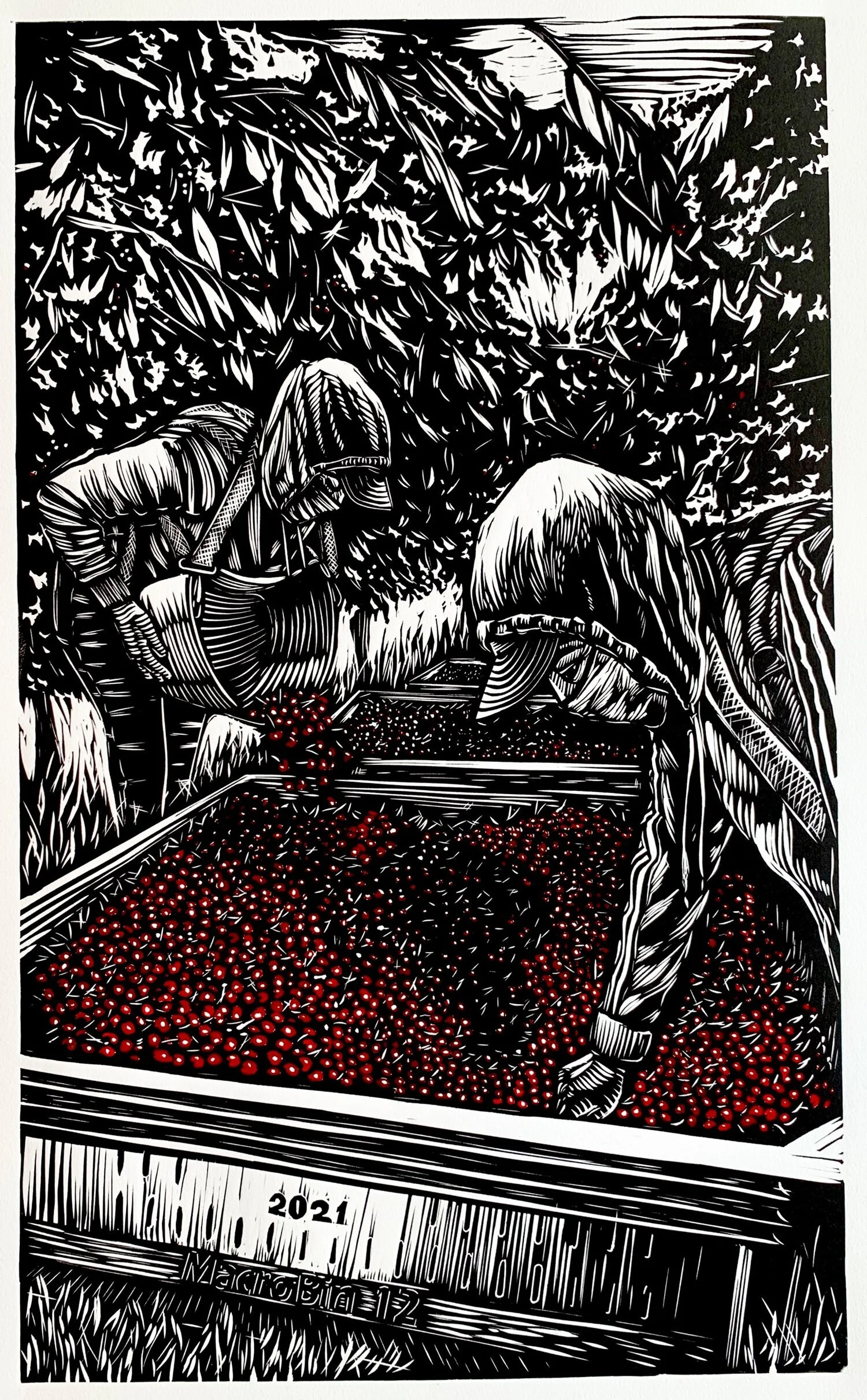 Pizcando Cherries, 2023. Linoleum print with watercolor.