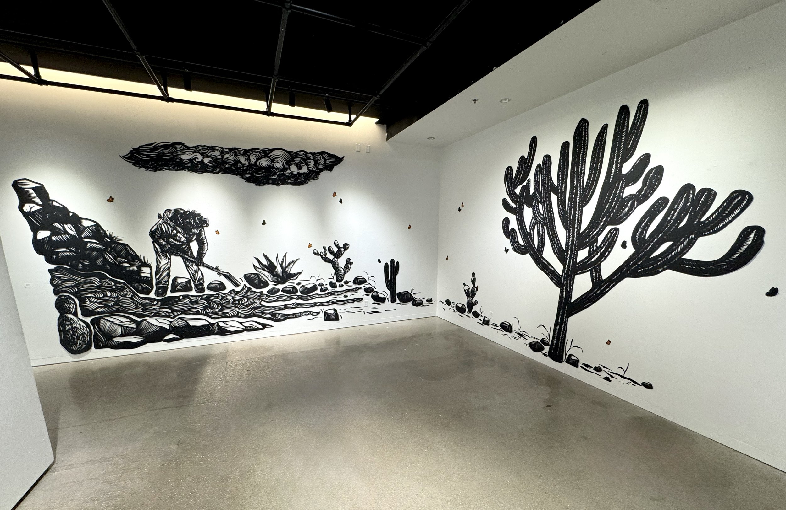 Moviendo Agua begins my MFA thesis installation, This is the first panel of five—and returns to a story I carry with me. I think of mi Madrina, moving water into my grandparents’ land in Mexico: guiding it by hand with a shovel, watching it run into the furrows, trusting the slow work of gravity, and the only one she has known her whole life. The water arrives the way memory does—trickling, steady, until it reaches my abuelos huerta. Here, water becomes a line of care and survival, traveling through the tierra to nourish the maíz, the crop that has always felt like a relative. Built from scanned relief prints and laser-cut black mat board, the silhouettes and their shifting shadows hold the presence of that labor of tradition, repetition, and essential to keep them alive.